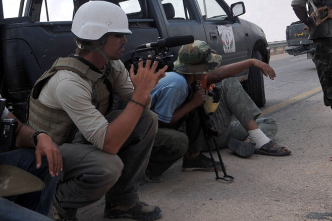 جيمس فولي (إلى اليسار) يقوم بالتصوير في سرت، بليبيا في 29 سبتمبر/أيلول 2011.