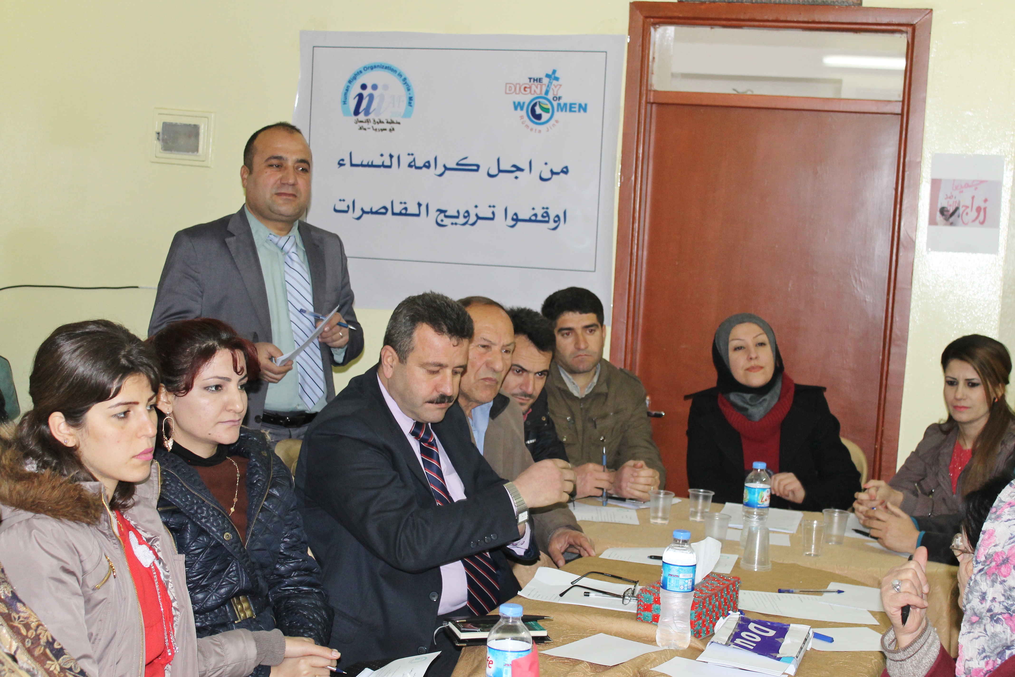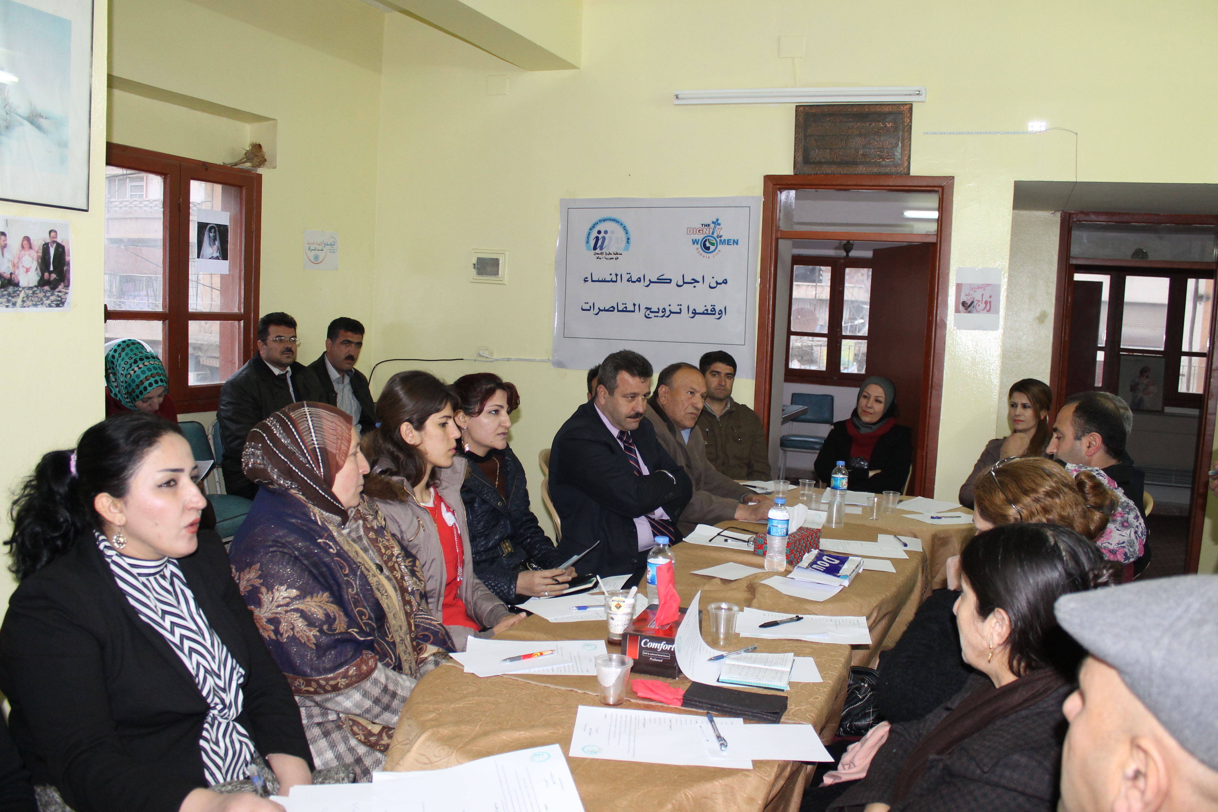 في اطار حملة شبكة ICAN أقامت منظمة حقوق الإنسان في سوريا ـ ماف في مدينة القامشلي جلسة حوار ونقاش عن ظاهرة زواج القاصرات بحضور ممثلين عن معظم منظمات المجتمع المدني ومنظمات لحقوق الإنسان والقوى السياسية, قدم الزميل عدنان سليمان تعريفا بشبكة بشبكة ايكان والحملة التي تقودها تحت عنوان “كرامة النساء”, ثم أدار الجلسة الزميل المحامي محمود عمر الجلسة الحوارية بمشاركة فعالة من الدكتورة غزالة شويش أخصائية التوليد وأمراض النساء, التي تحدثت بدورها عن هذه الظاهرة وتأثيراتها الضارة على القاصرات من الناحية الجسدية والأمراض التي يمكن أن تصاب بها وأثر ذلك على الحمل والتشوهات, كما شارك كل من الإستاذ فرخوزاد عيسى والآنسة نسرين رجو الأخصائيين في الإرشاد الاجتماعي والنفسي, وتحدثا بالتفصيل عن الظاهرة وآثارها النفسية والاجتماعية وحالات القلق والاكتئاب وغيرها من الأمراض المرافقة للظاهرة, كما تحدثا عن الآثار السلبية التي تتركها على حياة القاصر والمجتمع, وما ينجم عن هذه الظاهرة من تفكك للأسر, وقد أسهم الحضور بآرائهم ومداخلاتهم حول الأسباب والأثار والحلول والتوصيات تماشيا مع جدول حلقة النقاش التي تمت وفق الأبواب التالية: